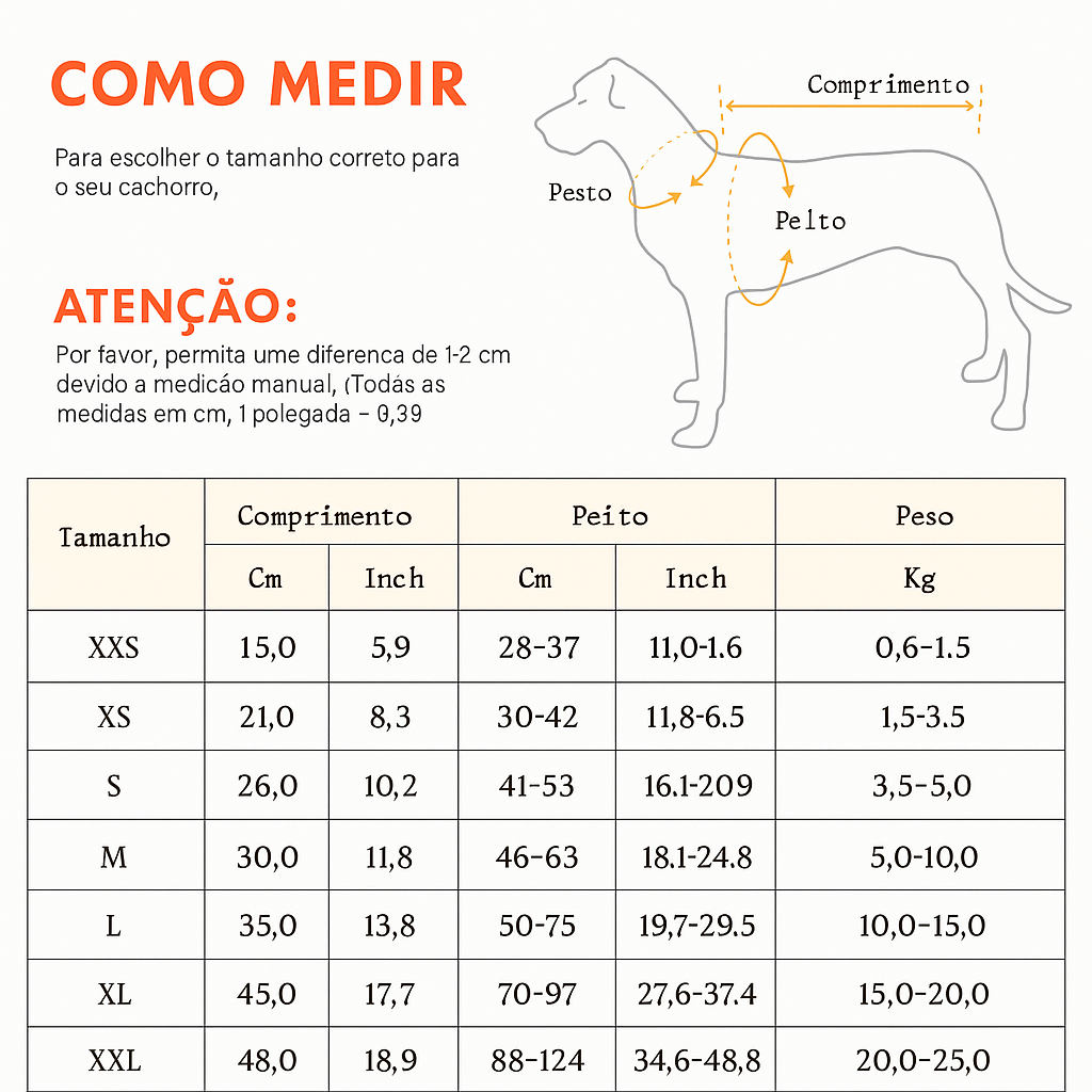 📏 Meça seu pet com atenção antes de comprar. Se estiver entre dois tamanhos, escolha o maior.